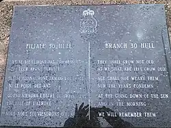 A plaque was erected by the Royal Canadian Legion Branch 30 Hull with a quote from the poem For the Fallen by Robert Laurence Binyon: "They shall grow not old, as we that are left grow old: Age shall not weary them, nor the years condemn. At the going down of the sun and in the morning We will remember them"