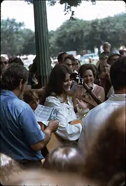 On December 4 federal marshals arrested Chávez and, for the first time in his life, César Chávez was put in jail.[26] Two days later, he was visited in the Monterey County jail in Salinas by former Olympic gold medal-winning decathlete Rafer Johnson and Ethel Kennedy, widow of slain Senator Robert F. Kennedy. Kennedy and Johnson were attacked by an anti-union mob on the steps of the jail, and only intervention by city police, Monterey county sheriff's deputies, and the Brown Berets prevented a riot and injury to the visitors.[4] Chávez was released by the Supreme Court of California on December 23, but the next day called a strike against six additional lettuce growers.[27]