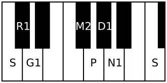 It is the 1st rāgam in the 7th chakra Rishi. The mnemonic name is Rishi-Pa. The mnemonic phrase is sa ra ga mi pa dha na.[2] Its ārohaṇa-avarohaṇa structure (ascending and descending scale) is as follows (see swaras in Carnatic music for details on below notation and terms):