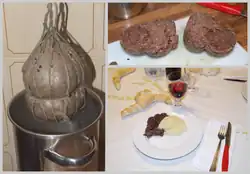 Salama da sugo has been part of Ferrara's culinary tradition for centuries. Riccardo Bacchelli in his Il mulino del Po (The Mill on the Po) mentions it twice.[3] Renzo Ravenna, despite his Jewish faith, consumed it, even if only once a year.[4] The Este Jewish community, which has been present in Ferrara for centuries, has produced a kosher variant.[5] Orio Vergani said he appreciated it thanks to Italo Balbo who, during his visits to Ferrara, let him know all the secrets of the city.[6]