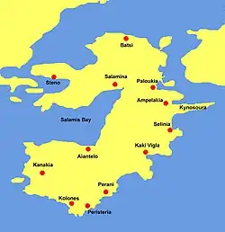 Salamis Bay (Greek: Όρμος Σαλαμίνος) is a bay on the west coast of Salamis Island, Greece. It connects with the Saronic Gulf to the west. Its maximum length is approximately 9 km from northeast to west. Cape Petriti forms its southwestern end. The main town of the island, Salamina, is on the northeastern end of the bay. The village Aianteio is on its south coast.