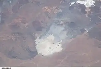 The principal salt has variously been stated to be either halite[9] or gypsum in the form of selenite.[10] There are minor amounts of calcium chloride, elemental sulfur[11] and ulexite.[12] The salts form a thick, brine-filled salt formation[13] with domes, mounds,[14] ridges, polygonal cracks,[2] tumuli[10] (an area covered with numerous domes is called "Dome Field"[9]) and a rough crust.[15] A raised area at the eastern end of the salar features small holes draped in gypsum[16] that appear to be produced by degassing.[17] Water at Salar de Pajonales is extremely salty,[18] with calcium chloride and calcium sulfate being the main components.[2] There is evidence of ongoing dissolution of the salt,[7] which has left deep pits[19] and cavities reaching 1–2 metres (3 ft 3 in – 6 ft 7 in) height.[20] The dissolution may be caused by salt draining into groundwater.[21] Salt deposition is influenced by the activity of cyanobacteria and sulfur-oxidizing bacteria,[22] which precipitate gypsum that may entomb microorganisms.[12]
