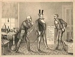 - ^ The image depicts a well-dressed man at center, looking down on an impoverished man holding an itemized list labeled "Monthly Expenses Clerk and Family" which shows that the man comes up $46.00 short each month, next to him on a chair is another itemized list labeled "Washington Price List" outlining the costs of various food items, lodging, and fuel. At left, Horace Greeley, who died several months before the "Salary Grab Act" came up in Congress, stands with his right hand raised and appears to be admonishing the man at center, holding a copy of the New-York Tribune in his left hand and papers in his coat pocket state "Bail for Jeff Davis—Universal Suffrage". At far left is a "Bill" on a table which reads, "66 2/3 pr. cent to Members of Congress on account of high prices in Washington". The U.S. Capitol building can be seen through a window.[4]