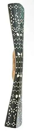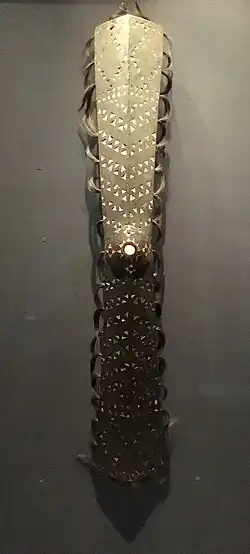 The Salawaku is an hour-glass shaped, long shield. The shield, including the handle, is carved from a single piece of wood. The upper and lower part are broad, and the shield is thinnest in the middle. At the front, it is rounded or has a slight V-shape so that the centre part comes to the foreground. The shield is slightly curved from top to bottom. On the rear, an elevated rib can be seen along the entire length, part of which is the handle in the middle. The front of the Salawaku is painted black using soot and plant juice. It is inlaid with mother-of-pearl and fragments of earthenware, and/or painted with kakean symbols (used by a secret society) and other ornaments; these materials often hint at the foreign aspect of the shields. The shield forms a 'body', and the inlaid patterns refer to certain bodily parts. The upper segment refers to the head, and the lower part to the feet. Arteries run lengthwise. The elevated rib on the rear side represents the spine and, just below the handle, the larynx. Inlays just above the centre represents the eyes. Their number allegedly refers to the number of enemies killed by the ancestors. The shield must be shorter than two arms’ length, in order to avoid the shield's end, and held against the chin to avoid tears falling on the shield, as 'courage and sadness must be separated.'[3]