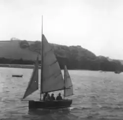 The term Salcombe Yawl refers to a small sailing dinghy restricted class native to Salcombe in South Devon, and also to the traditional sailing vessel from the area upon which that class was based, with a 200-year history.[2] The current class of vessel has about the size of a Merlin Rocket, that is 4.88 metres (16.0 ft) and about 180 have been built of which 80% are still in use. It is built traditionally by hand from mahogany, and is clinker built. The centre plate is cast iron, but more recent Yawls have bronze plates. While it is rigged as a ketch with the mizzen ahead of the rudder post, the label yawl is probably derived from a corruption of the word yole, meaning a small inshore fishing boat. Designers, work within the class restrictions, adding innovations to each vessel.[3] It is raced in two classes depending on the age of the boat. A newly built boat in 2009 would cost £40,000 while a second hand vessel would be half of that.[4] There is a glassfibre derivative with aluminium spars called a Devon Yawl. The mould for this was taken from a 1968 Salcombe Yawl and because of the nature of its construction is a one-design. There are approximately 300 Devon Yawls and they are built both in the UK and USA.