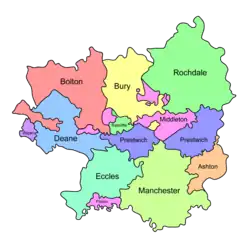 Salfordshire comprised several parishes and townships during its history. These were not static, but fragmented with the establishment of daughter churches and chapels and increases in population. The parish of Prestwich-cum-Oldham originally included the parishes of Bury, Middleton and Radcliffe,[18] and the parish of Manchester originally included the parish of Ashton-under-Lyne.[19] The township of Hundersfield was one of Rochdale parish's four original townships, but was itself split into four.[20] Similarly, Prestwich-cum-Oldham was later split into two separate parishes of Prestwich and Oldham.