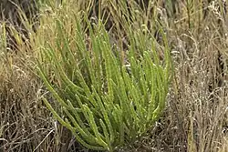 Salicornia utahensis, synonym Sarcocornia utahensis,[1] is a species of flowering plant in the amaranth family known by the common name Utah swampfire.[2] It is native to the southwestern United States, where it can be found in desert habitat, generally in areas with alkaline or saline soils, such as playas. This halophytic perennial herb or subshrub grows in low matted clumps of woody stem bases anchored to the substrate by rhizome systems. The stem grows erect into fleshy green branches. The inflorescences are within the distal parts of the branches, which are ringed with tiny flat flowers.