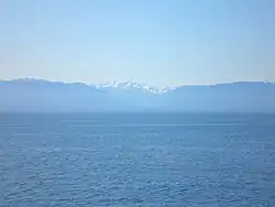 ![]() The Salish Sea, showing the open Pacific Ocean at lower left, and from there, heading inland: the Strait of Juan de Fuca, the narrow Puget Sound at lower right, and the wide Strait of Georgia at upper center. Sediment from the Fraser River shows as a greenish plume in the Strait of Georgia. | |
