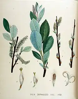 Salix daphnoides, the European violet willow, is a species of plant in the family Salicaceae. It can grow as a large shrub or small tree, normally reaching a height of 6–8 m (20–26 ft), but can grow up to 12 m (39 ft) tall.[2]