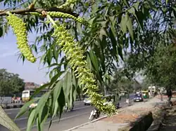 Salix tetrasperma, commonly called Indian willow, is a medium-sized tree of wet and swampy places, shedding its leaves at the end of monsoon season. It flowers after leafing. The bark is rough, with deep, vertical fissures and the young shoots leaves are silky. The leaves are lance-like, or ovate-lancelike, 8–15 cm long, with minutely and regularly toothed margins. The male sweet scented catkins are 5–10 cm long, and are borne on leafy branchlets. The female catkins are 8–12 cm long. The capsules are long, stipulate, in groups of 3 to 4.