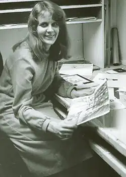 Sally Cruikshank was born in Chatham, New Jersey,[4] the daughter of parents Rose and Ernest.[5] Her parents were both Southerners, with her father, an accountant who worked in nearby New York City, New York, holding a Phi Beta Kappa key from Duke University, in North Carolina. Ernest's mother, Margaret Mordecai Jones Cruikshank, had been the president of the boarding school formerly known as St. Mary's College in that state.[6] Cruikshank has a brother,[7] and had a sister, Carol,[8] who died in 1991.[9] Their maternal aunt, Bea, was a painter from the 1910s to the 1940s, whose work included a portrait commission by US President Franklin Delano Roosevelt.[10] Cruikshank studied art at Smith College,[4] where in her junior year art teacher Elliot Offner sent slides of her colored-pencil and clay-relief-on-paper drawings to a screening committee that resulted in a scholarship to the two-month Yale Summer Art School. At the urging of a classmate there, Warner Wada, she began considering adapting her drawing style to animation.[11] Returning to Smith for her senior year and obtaining the primer Animation by Preston Blair, Cruikshank, with additional research, arranged for a special-studies class in animation. With an animation stand consisting of a Bolex camera attached to a photo enlarger, constructed by instructor David Batchelder, she produced her first animated short, the three-minute, 16mm "Ducky".[11] Done with watercolor and paper animation, it starred a prototype version[12] of her future recurring character Quasi, which one writer characterized as "an infantile duck with buck front teeth, thick glasses and a red cape".[13] Cruikshank, describing her anthropomorphic characters, said, "My ducks are based on the ducks from Carl Barks' comics. But I guess they got twisted in memory, because people don't seem to see much similarity between them."[12]