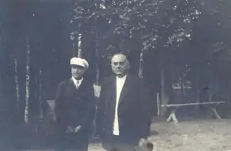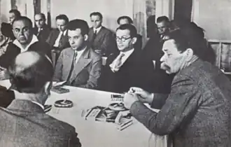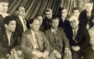 In 1934, Salman Mumtaz participated in the First Congress of Soviet Writers held in the House of the Unions, Moscow.[18] Mammad Kazim Alakbarli, who attended the conference, made a speech and noted in his report that Salman Mumtaz played a major role in examining the legacy of poet Mirza Shafi Vazeh and his incomparable services for Azerbaijani literature.[19] Salman Mumtaz was also a close friend of Maxim Gorky. He met the great writer at the first congress of Writers of the USSR. Maxim Gorky took several photos with Azerbaijani writers. In the photos, Salman Mumtaz is sitting next to Maxim Gorky. According to the information received, Gorky bought a house in Moscow for Salman Mumtaz.[10] In that year, Salman Mumtaz was invaluable in the delegation sent from Azerbaijan to Moscow to participate in the 1000th anniversary of Ferdowsi. [14]