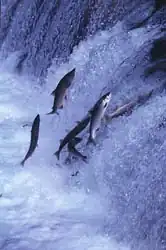 Salmon negotiate waterfalls and rapids by leaping or jumping. They have been recorded making vertical jumps as high as 3.65 metres (12 ft).[39] The height that can be achieved by a salmon depends on the position of the standing wave or hydraulic jump at the base of the fall, as well as how deep the water is.[39]