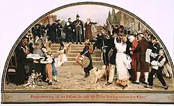 In honour of his 50th anniversary, scholars, architects, merchants, writers and friends gathered for lunch on 9 December 1842 in a daytime restaurant in Berlin.The room was decorated by the royal landscape and theater decoration painter Johann Karl Jakob Gerst (1792–1854) with the Portrait of Sachs under Flower garlands. Part of the table decoration had the shape of the Sloping Tower of Pisa, with the inscription "Sachs' indestructible Pisébau".Among the dinner speakers and guests were community leader Joseph Lehmann, editor of the magazine for foreign literature, Dr. Löwe as organizer of the festival and Prof. Wilhelm Stier. Stier had been trained by Solomon as a student of the Bauakademie in 1816 and they had become friends. Another speaker was the writer, philosopher, bookseller and humorist Dr. Louis Weyl. (* 23 April 1817; † 9 September 1851). With his humorous lecture on the arts, especially architecture, and a table song, he delighted the society.[58]
