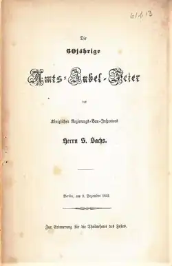- ^ Die 50jährige Amts-Jubel-Feier des Königlichen Regierungsinspektor Herrn S.Sachs Berlin, am 9 Dezember 1842 zur Erinnerung für die Theilnehmer des Festes Gedruckt von F. Weidle in Berlin pp. 11–12 (mit freundlicher Unterstützung von Michel Fischer Senior Library Assistant Leopold Muller Memorial Library Bodleian Libraries, University of Oxford)