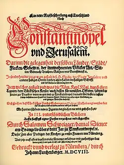 In 1576, having completed his studies and being in search of employment, he was hired as embassy chaplain by Joachim von Sintzendorff, Habsburg ambassador to Istanbul (1578–81).[3] He traveled as a Habsburgian envoy to Constantinople[4] with an Austrian delegation from Vienna on a diplomatic mission of Emperor Rudolf II to Sultan Murad III.[5] He spent several years attached the Habsburg embassy,[6] in the role of Hofprediger (court preacher)[7] successor to Stephan Gerlach.[8] In this travel diary, he vividly describes his personal experiences and also provides an interesting insight into life in the former Ottoman Empire. He deduced that "Serbians, Bulgarians, Rascians, have their origins in the ancient German tribes of Daci",[9] and also wrote about Bulgarian jewelry, curious at the nose rings he saw worn by the women and the "exoticism" he witnessed.[10] He also commented on jugglers, fires, the "clumsy" music of the Turks, their food, customs, and buildings.
