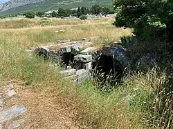 The city quickly acquired Roman characteristics: walls, a forum, a theatre, an amphitheatre which are the most conspicuous above-ground remains today, public baths, and an aqueduct.[8] Many inscriptions in both Latin and Greek have been found both inside the walls and in the cemeteries outside, since Romans forbade burials inside the city boundaries. Several fine marbles sarcophagi from those cemeteries are now in the Archaeological Museum of Split. All this archaeological evidence attests to the city's prosperity and integration into the Roman Empire. Salona had a mint that was connected with the mint in Sirmium and gold and silver mines in the Dinaric Alps through Via Argentaria.[9][10][11][12]
