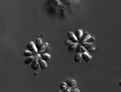 S. rosetta was named for the rosette-shaped colonies formed by its cells.[5] The colonies are held together by adhesion molecules long thought to be found only in Metazoan organisms.[6] Additionally, recent evidence suggests that a bacterial sulfonolipid, called rosette inducing factor (RIF-1) and produced by Algoriphagus machipongonensis, triggers colony formation in S. rosetta.[7] The effect of RIF-1 on colony formation in S. rosetta has been suggested as an example of how interactions between bacteria and eukaryotes may have led to multicellularity in the latter.