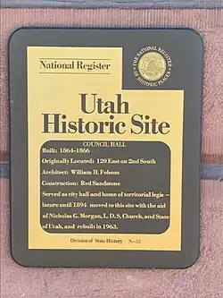 Council Hall was originally Salt Lake City Hall, built to replace an older, smaller city hall completed just six years earlier on the eve of the Utah War, a standoff between Latter-day Saints ("Mormons") and federal troops. This small city hall was almost immediately inadequate for the growing city, so planning work on a new City Hall began by 1863.