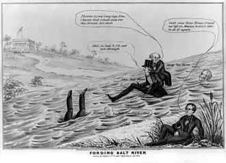 In the period of the 1848 election campaign, political cartoonists employed visual and textual references of Salt River as a means of satire to sway public opinion on the strengths and weaknesses of opposing political candidates. Salt River was described in context as a "tantalizing, semi-mythical waterway whose treacherous shoals were synonymous with ruination of great leaders and their parties."[3] In Hutter’s "Ho for Salt River!", she brings up how backdrops of Salt River were used more than to just symbolise political defeat; Salt River was also a metaphor for the massive political barriers candidates faced towards their opposition and the hardships they encountered.