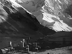Inspired by a tour of the Caucasus, the writer and journalist Sergei Tretyakov wrote a newspaper article that gave Kalatozov the idea for the film. Tretyakov then wrote a script for Kalatozov, and shooting began in the village of Ushguli in Upper Svanetia.[4] Originally the film was planned to be a fictional feature film, but ultimately Viktor Shklovsky edited the footage Kalatozov had shot in Svanetia into a documentary film.[1] The authenticity of some scenes has been disputed by the Svan people who deny that some of the customs shown have ever existed.[5] The cinematography of Mikhail Kalatozov and the cinematographer Shalva Gegelashvili has been described as expressionistic due to its use of dramatic shadows, silhouettes against a dramatic skyline and Dutch angles.[6]