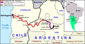 The Salta–Antofagasta railway, also named Huaytiquina,[2] is a non-electrified single track railway line that links Argentina and Chile passing through the Andes. It is a 1,000 mm (3 ft 3+3⁄8 in) metre gauge railway with a total length of 941 km (571 in Argentina[3] and 330 in Chile), connecting the city of Salta (Argentina) to the one of Antofagasta (Chile), on the Pacific Ocean, passing through the Puna de Atacama and Atacama Desert.