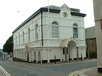 The second municipal building was a 16th century market house located about 50 yards (46 m) to the east of the original building.[2] It was reconstructed in the neoclassical style in brick and masonry between 1775 and 1780.[2] The market house was originally arcaded on the ground floor, so that markets could be held, with an assembly hall, known as the Long Room, on the first floor.[2] A series of Doric order columns supported the first floor structure.[2] Saltash had a very small electorate and a dominant patron (the Buller family), which meant it was recognised by the UK Parliament as a rotten borough: the right of the borough to elect members of parliament was removed by the Reform Act 1832.[5] In 1841, borough officials decided to relocate from the original guildhall to the Long Room in the market house which then became the new headquarters of the borough.[2] The borough council, which continued to meet in the new guildhall, was reformed under the Municipal Corporations Act 1883.[6][7]