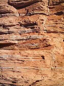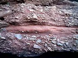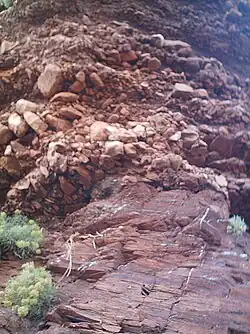 Eight metres above the Goniatite Band is a metre-thick limestone conglomerate. This displays grading, contains blocks up to 50 cm across, as well as small micritic limestone clasts, which contain Frasnian and Famennian conodonts.[2]