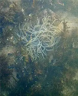 The rocky coastline at Saltern Cove supports diverse communities of intertidal plants and animals. Along the lower shore the coarse grained rocks are partly covered by brown seaweeds such as Flat wrack (Fucus spiralis) and Knotted wrack Ascophyllum nodosum, while pools and crevices in the rocks provide shelter for a wide variety of algal species, such as the red seaweed Corallina officinalis. Animals include the Snakelocks anemone Anemonia viridis, the Spotted goby Gobius ruthensparri, Periwinkles Littorina spp. and the Squat lobster Galathea strigosa.