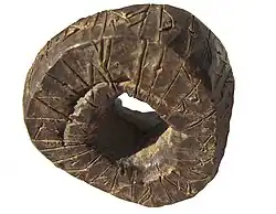 The spindle-whorl is an everyday object from the household, and particularly female, sphere. This may suggest the owner was also female and it closely resembles other finds such as an 11th-century soapstone whorl from Aust-Agder in Norway with an inscription that reads kunitr kerþsnalt ("Gunnhildr made the spindle-whorl"), and one from East Yorkshire that has rune-like markings but cannot be read.[22] Given the scarcity of comparative material, it is unclear whether the carver was a Scandinavian speaker from Lincolnshire or visiting Lincolnshire, however that the spindle-whorl fits into a type typical of the region, suggests a local nature for the carver.[23] 12th century contacts between Lincolnshire and Norway are recorded, including in a writ from King Henry II that enforce the right to toll Norwegian merchants in Grimsby.[2] [3]