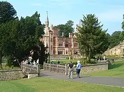 There are eleven listed buildings in Saltwell Park.[19] Saltwell Towers, former home of William Wailes and later to lawyer Joseph Shipley (founder of the nearby Shipley Art Gallery), was the seat of the former Saltwellgate estate and has been described by a BBC report as a "fairytale mansion".[19][20][21] The building is a dark red and yellow brick construction with asymmetrical towers, tall chimney stacks and corner turrets.[22] It has been used for a number of purposes, including as a hospital during the First World War and as a museum from 1933 to 1969, but was then abandoned and fell into considerable disrepair.[20] However, after a £3 million, five-year refurbishment programme was completed in 2004, the building was officially reopened as a visitors centre in the presence of Wailes' great-great-grandson.[21] Saltwell Towers today includes a cafe, some pieces of local art, an exhibition on the history of the park and also a stained glass centrepiece commissioned from a local artist.[23] A Gateshead Blue Plaque in commemoration of Wailes was installed in 2005.[24] The mansion was protected in 1973 as a Grade II listed building,[22] along with the two storey, sandstone belvedere walls which surround the west and south of the mansion. These are replete with stairs and corner battlements and the entire walls are conjoined by a walkway which is open to the public.[25]