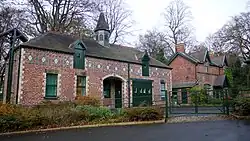 A stable block is at the north-west of Saltwell Towers, built in 1871 in the same style as the mansion in red brick and with a slate roof. This is a Grade II listed building and is now an educational area for schools and local community groups.[26][27] Also to the north-west of Saltwell Towers is the Charlton Memorial Drinking Fountain, a stone and granite fountain inscribed in memory of George Charlton, the mayor of Gateshead between 1874 and 1875.[28] This is Grade II listed, as is the 'Salte Well' at the west entrance to the central section of the park. The latter is dated 1872 and is a sandstone construction with a basin in the central alcove.[29] Midway along the Broadwalk in the north section of the park is a Grade II listed bronze statue of Alderman John Lucas, mounted on a sandstone plinth and granite base. Built in 1902, it was paid for by public subscription.[30] The wrought iron gates and accompanying stone piers which greet visitors at the north-eastern entrance to the park are also Grade II listed.[31]