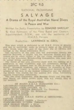 Salvage is a 1936 Australian radio play by Edmund Barclay about the rescue of a submarine.[1] It was called "one of the most ambitious attempts at dramatic realism ever attempted by the Sydney production department of tire Broadcasting Commission."[2]