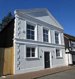 The building was extended at the rear in 1821 as the congregation grew,[4] then in about 1830 it was rebuilt on the same site[2][8] at a cost of £634.[9] By January 1867, though, the congregation had expanded so much that a new chapel was needed,[10] and the trustees decided to sell the Mint Street building. Land at Bridge Street was found and purchased and the new Congregational chapel was quickly built, opening on 28 October 1868.[11] The former chapel was then bought by a group of Wesleyan Methodists for £450,[12] and they converted it into Godalming's first permanent Methodist chapel. (A Methodist group had existed for some years until 1797, and meetings recommenced in 1826 in a hired room; a small chapel was also built at Farncombe, the neighbouring village, in 1840.) As Godalming Wesleyan Chapel it opened in 1869, and the congregation grew steadily.[13] It was in turn replaced by a new church—the Hugh Price Hughes Memorial Chapel (now Godalming United Church)—on Bridge Street, almost opposite the Congregational chapel, in 1903.[2][8][10] The Methodist Church retained the Mint Street building at first and leased it to a Salvation Army congregation, then sold it to them in 1918.[2] Alterations were made in 1930, and the windows were also replaced in the 20th century. In 1990 the building was reported to be "in a state of disrepair",[14] but further alterations were made by 1994.[8] The Salvation Army stopped using the hall with effect from 29 September 2012.[15] A planning application to convert the disused hall into an office was submitted in May 2013 and approved by Waverley Borough Council two months later.[16]