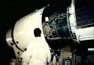 Salyut 4 (DOS 4) (Russian: Салют-4, lit. 'Salute 4') was a Salyut space station launched on December 26, 1974 into an orbit with an apogee of 355 km, a perigee of 343 km and an orbital inclination of 51.6 degrees. It was essentially a copy of the DOS 3 (or Kosmos 557), and unlike its ill-fated sibling it was a complete success. Three crews attempted to make stays aboard Salyut 4 (Soyuz 17 and Soyuz 18 docked; Soyuz 18a suffered a launch abort). The second stay was for 63 days duration, and an unmanned capsule, called Soyuz 20, remained docked to the station for three months, proving the system's long-term durability despite some deterioration of the environmental system during Soyuz 18's mission. Salyut 4 was deorbited February 2, 1977, and re-entered the Earth's atmosphere on February 3.
