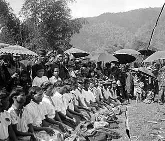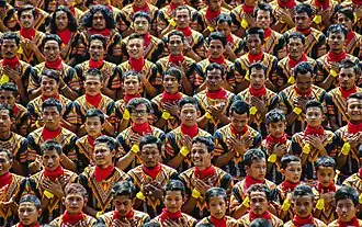 Saman (also known as the dance of a thousand hands) is one of the most popular dances in Indonesia. Its origin is from the Gayo ethnic group from Gayo Lues, Aceh province, Indonesia, and it is usually performed to celebrate important occasions.[1] The dance is characterized by its fast-paced rhythm and common harmony between dancers. These two elements are key figures of Saman and are among the reasons Saman is widely known and practiced in Indonesia, besides being relatively easy to learn.