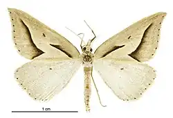 Primaries pale straw yellow; an oblique interno-basal litura, a dot at the end of the cell, and a discal transverse line terminating in an acute < -shaped angle, piceous; the discal line diffused externally; a marginal series of black dots; secondaries white, with the fringe creamy; a marginal series of black dots; thorax pale straw yellow, abdomen white : primaries below pale testaceous, whitish on internal area; markings (excepting the marginal dots, which are united by a slender brown line) only visible through the wing; secondaries white, the costal area tinted with testaceous, and sparsely irrorated with brown; a small black dot at the end of cell; a marginal series of black dots; fringe creamy : body below pale straw yellow. Expanse of wings 1 inch 2 lines.[2]