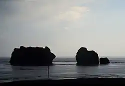 One of the best known sites in Samani is the Oya-ko rocks (親子岩, Oya-ko iwa) that sit just offshore. They are known by this name, meaning Parents-and-Child, because they are a formation of two larger rocks and smaller one. Oya-ko is nesting site for cormorants and other sea birds.