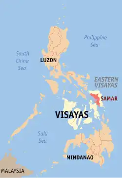 Samar's 2nd congressional district is one of the two congressional districts of the Philippines in the province of Samar. It has been represented in the House of Representatives of the Philippines since 1916 and earlier in the Philippine Assembly from 1907 to 1916.[3] The district consists of the provincial capital city of Catbalogan and adjacent municipalities of Basey, Calbiga, Daram, Hinabangan, Jiabong, Marabut, Motiong, Paranas, Pinabacdao, San Jose de Buan, San Sebastian, Santa Rita, Talalora, Villareal and Zumarraga. Prior to its second dissolution in 1965 due to the split of the historical province of Samar, it consisted of the old province's western portion that is now known as Samar (formerly Western Samar), except Catbalogan, which was part of the 1st district.[4] It is currently represented in the 19th Congress by Reynolds Michael Tan of the Lakas–CMD.[5]