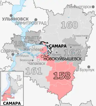 Samara constituency (No. 158[a]) is a Russian legislative constituency in Samara Oblast. In its current configuration the constituency covers parts of Samara, Novokuybyshevsk and south-eastern Samara Oblast.