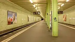 During the GDR the station was covered with pictures of SED propaganda that was removed in 1990, together with Neo-Nazism. After 1993 there were anti-violence ads hanging on the walls, put up after 23-old Silvio Meier was killed in this station by right-wingers.[1] These were all removed during the modernisation programme in 2004. Today there is an official memorial plaque in the underground station commemorating the killed young man.[2] In 2011, an elevator was constructed to provide barrier-free access.