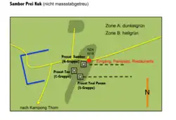 Sambor Prei Kuk (Isanapura) (Khmer: សំបូរព្រៃគុហ៍, Sâmbor Prey Kŭh [sɑmboː prəj kuʔ]) is an archaeological site in Cambodia located in Kampong Thom Province, 30 km (19 mi) north of Kampong Thom, the provincial capital, 176 km (109 mi) east of Angkor and 206 km (128 mi) north of Phnom Penh. The now ruined complex dates back to the Pre-Angkorian Chenla Kingdom (late 6th to 9th century), established by king Isanavarman I as central royal sanctuary and capital, known then as "Isanapura" (Khmer: ឦសានបុរៈ, Eisanbŏreă [ʔəjsaːnɓoreaʔ]).[1][2] In 2017, Sambor Prei Kuk was declared a UNESCO World Heritage Site.[3]