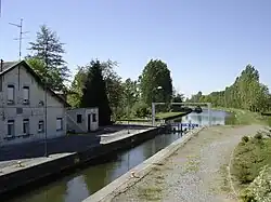 The Canal de la Sambre à l'Oise (French pronunciation: [kanal də la sɑ̃bʁ a lwaz]) is a canal in northern France. It forms a connection between the canalised river Sambre (Meuse basin) at Landrecies and the Oise (Seine basin) at La Fère. The canal is 71 kilometres (44 mi) long, and has 38 locks. The junction made at La Fère is with a branch of the Canal de Saint-Quentin, while the Canal latéral à l'Oise is joined 10.5 km further downstream at Chauny. It was used by the standard Freycinet-gauge péniches, 38.50 metres (126.3 ft) long, and 5.05 metres (16.6 ft) in beam, carrying up to 250 tonnes. The canal, also a popular waterway for boats heading south from the Netherlands and Belgium to the central French waterways, had to be closed in 2006 when two aqueducts were found to be in danger of failing. Funding has been put in place by the owner, Voies Navigables de France, and the local authorities, with support from the State.[1] The canal was reopened in July 2021.[2]