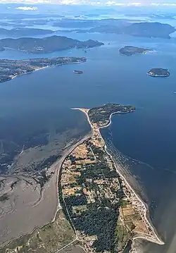 Samish Island is named after the Samish people, a Coast Salish people of the Pacific Northwest. Both the Samish and the Nuwhaha peoples used the island as part of their traditional territory.[2] The western end of the island is named Xwtl’échqs in the Samish language and sƛ̕əpqs in the Lushootseed language, both meaning "deepwater point" in the respective languages. The eastern end is named A7ts’íqen in Samish and qʷəqʷaliqs in Lushootseed.[3] The narrow isthmus connecting the two areas is named bəsbəsič, meaning "thin cords."[4]