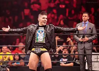 On February 7, 2019, Guevara was announced to have signed with the newly formed All Elite Wrestling (AEW).[25] At the promotion's inaugural event, Double or Nothing, on May 25, Guevara was defeated by Kip Sabian.[26] At Fight for the Fallen on July 13, Guevara teamed with MJF and Shawn Spears to defeat Darby Allin, Jimmy Havoc and Joey Janela in a six-man tag team match.[27] On the premiere episode of AEW Dynamite on October 2, Guevara lost to Cody. After the match, Guevara shook hands with Cody, before AEW World Champion Chris Jericho viciously attacked Cody from behind in front of him. Later on that night, Guevara established himself as a heel when he assisted AEW World Champion Chris Jericho, Jake Hager (who made his AEW debut), Santana and Ortiz attacking Cody, The Young Bucks and Cody's half-brother Dustin Rhodes.[28] They created a group that would become known as "The Inner Circle".[29] Guevara would then begin a feud with Darby Allin leading into 2020,[30][31] all the while assisting Jericho in his rivalries and championship defenses.[32][33] At Revolution on February 29, 2020, Guevara was defeated by Allin.[34] On the March 25 episode of AEW, The Inner Circle and The Elite were set to compete in a Blood and Guts match, but the COVID-19 outbreak would cause AEW to postpone the match.[35] Guevara would then compete in a tournament to crown the inaugural AEW TNT Champion. He was again beaten by Allin in the first round of the tournament.[36] A match between Matt Hardy and The Elite (Adam Page, Kenny Omega and The Young Bucks) and The Inner Circle would be announced for Double or Nothing, called a Stadium Stampede match. At the event, The Inner Circle faced The Elite and Matt Hardy, but were unsuccessful in winning.[37]