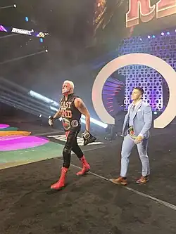 On September 29, Guevara won the AEW TNT Championship at Dynamite by defeating Miro.[52] The next week, Guevara made his first successful defense against a debuting Bobby Fish.[53] On December 25, at the special Holiday Bash episode of Rampage, Guevara lost the title to Cody Rhodes, ending his reign at 87 days.[54] A TNT Championship rematch between Rhodes and Guevara was scheduled to take place at Battle of the Belts I on January 8, 2022. However, Rhodes was forced to withdraw after being exposed to COVID-19. An interim TNT title was created as a result, with a match between Guevara and Cody's brother, Dustin, being scheduled at Battle of the Belts instead. Guevara would go on to win the match and become the interim TNT champion.[55] On January 26 at AEW Beach Break, Guevara defeated Cody Rhodes in a ladder match to unify the belts, becoming the undisputed (and two-time) TNT Champion.[56] The match was awarded 5 stars by professional wrestling journalist Dave Meltzer, giving Guevara his first 5-star match.[57] On the February 9, 2022, episode of AEW Dynamite, the Inner Circle had a team meeting that ended with Sammy Guevara throwing his vest and walking out.[58] At Revolution 2022, Guevara would win a Tornado tag team match with Allin and Sting over Andrade El Idolo, Matt Hardy, and Isiah Kassidy.