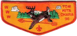 After being chartered in December 1936, the first formal lodge meeting was held early in 1937 in Wausau, Wisconsin. That same summer Samoset Council's executive board approved the Order of the Arrow as an official part of the council's Boy Scout camping program. As tradition indicates, a deer leaped through the first lodge ceremony.[21] The name of the lodge, Tom Kita Chara, means "leaping buck" in the language of the Chippewa Indians, who lived in north-central Wisconsin. The lodge number is 96, meaning that it was the 96th lodge of the Order of the Arrow to be formed. The lodge name may have been briefly changed to "Tesomas" in 1938, or that may have been its nickname, but the name "Tom Kita Chara" was official by 1939 or 1940.[22]