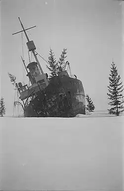 While waiting for the spring thaw, Sampo was camouflaged with tree branches to resemble a small island. This was not very successful, because during the last weeks of the Winter War the Soviet bombers made several attempts to destroy the ship. However, despite dropping at least 250 bombs on the grounded icebreaker the enemy pilots never scored a hit.[22]