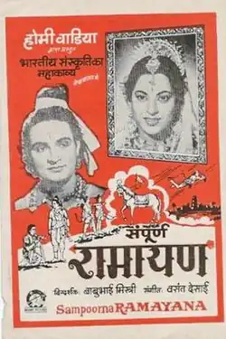 Sampoorna Ramayana (transl. The Complete Ramayana) is a 1961 Indian Hindi-language Hindu mythological film directed by Babubhai Mistry, based on the Hindu epic Ramayana by Valmiki, starring Mahipal and Anita Guha as Rama and Sita respectively. The film was a box office hit,[1] and became a milestone in the history of Hindu mythology.[2] It was the second significant Hindi film based on Rama, after Vijay Bhatt's hugely popular Ram Rajya (1943). Babubhai, known for his special effects throughout his career, made extensive use of effects to enhance dramatics.[3] The film also made lead actor Anita Guha, who played the role of Sita, a household name. Lata Mangeshkar sang two of the most top-class semi-classical songs in this movie, namely "San Sanan, Sanan, Sanana, Ja Re O Pawan" and "Badalon Barso Nayan Ki Or Se", which are still very popular.[4]