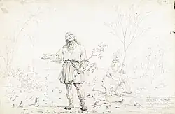 In Eastern Finland, Sampsa is primarily known in the runic song describing the origin of trees. Despite this, it seems likely that his original role was as a protector of field crops. The most comprehensive story of the awakening of Sampsa describes how the wealthy land owner Ahti tries to get someone to awaken Sampsa. A wolf tries to do so, hoping to get a hefty reward, but fails. Summer boy, who doesn't think of a reward, goes to awaken Sampsa and is successful. Sampsa then proceeds to sow all vegetation. In some versions, it is winter boy who first fails to awaken Sampsa. The place where Sampsa is sleeping is described as an island without trees.[1][7] This story includes the line: Ennen Ahti maita puuttu, / Ennenkun Sämpsä siemeniä ("Ahti would sooner run out of land than Sämpsä out of seeds").[8]